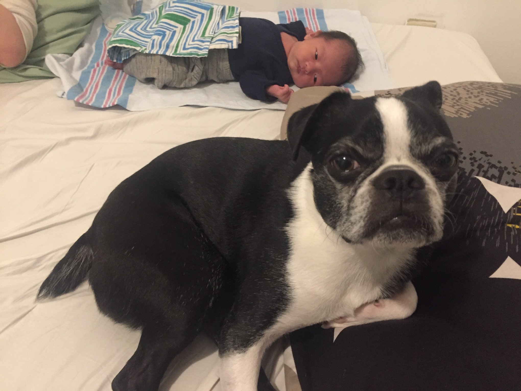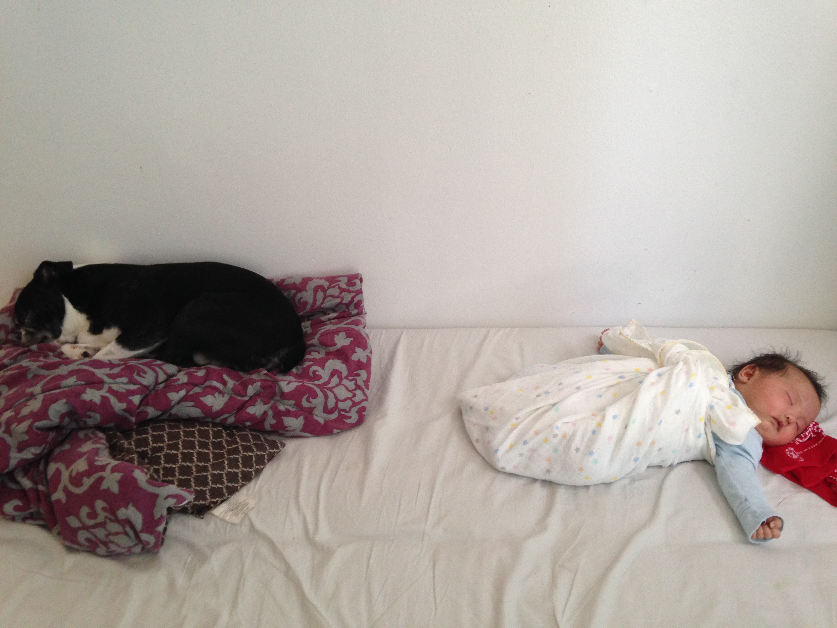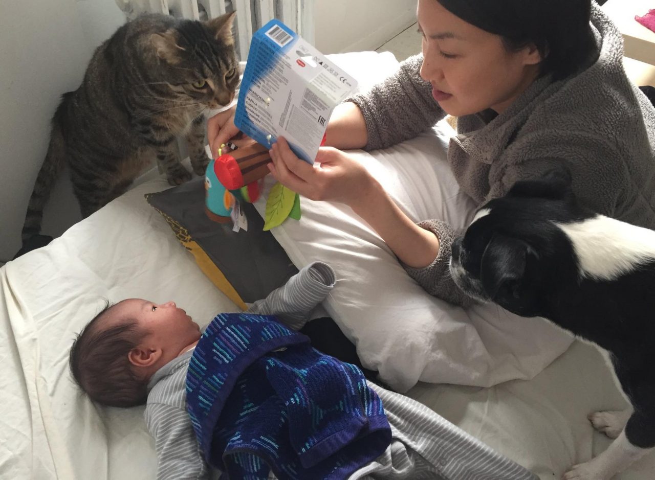 以前に本で、急に赤ん坊がうちに来ると動物たちがびっくりして赤ん坊に攻撃をすることがあると妊娠中に勉強しました。そのために赤ん坊の匂いを彼らに嗅がせることは彼らを安心させるためにとても必要なことなのです。2人ともクンクンと慎重に今まで嗅いだことのないその匂いを嗅いでいました。