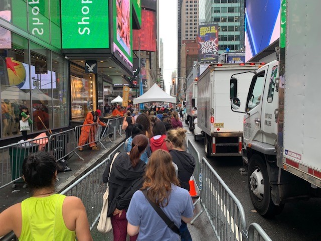 予約しておいた登録確認が終わると、ヨガマットとギフトバッグを受け取りいざ出陣です。ラインの流れに従って進むと、もうそこはタイムズスクエア。