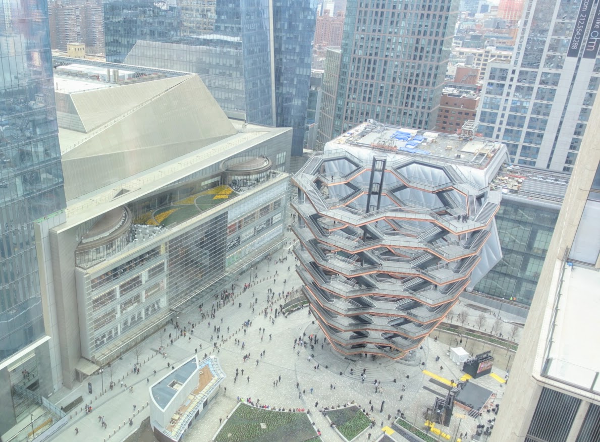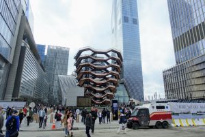 真っ先に目に入るのがハドソンヤードの象徴となる建築アート「ベッセル」。有名デザイナーのトーマス・ヘザウィックが古代インドの階段井戸からインスピレーションを受け創作しました。