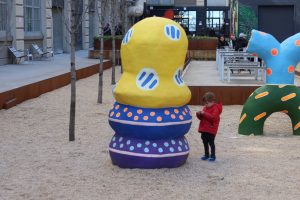 ビルディング3と4の間にある、カラフルなアートが並ぶ中庭。ショッピングに飽きてきた子供を思い切り走らせることもできます。