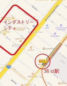 インダストリーシティはブルックリンのサンセットパークというエリアに位置します。地下鉄D、N、R線の36 St駅で降りて1ブロック西に歩けば、すぐに倉庫ビルが見えてきます。